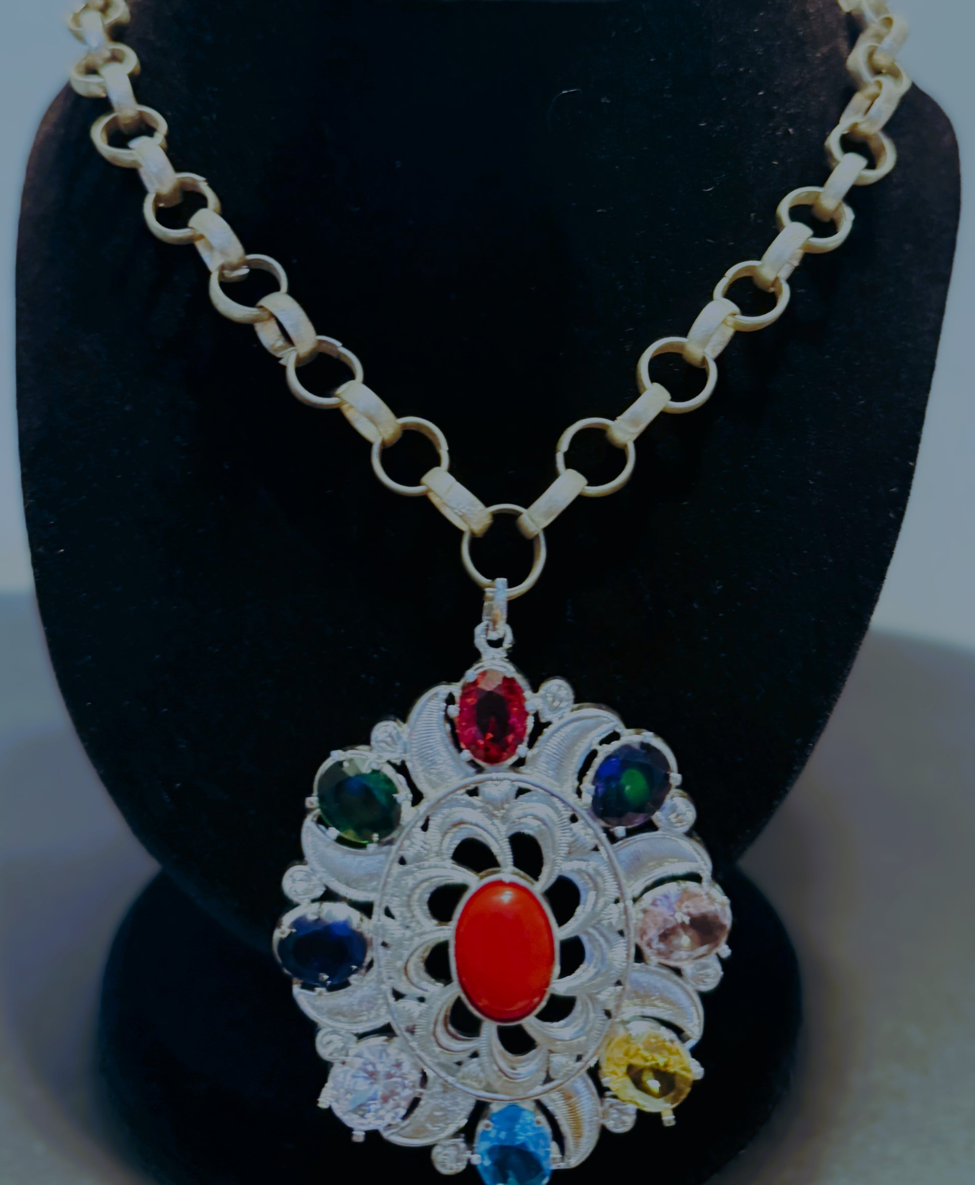 Handmade Navaratna Pendant Necklace – Silver-Plated Chain from Nepal
