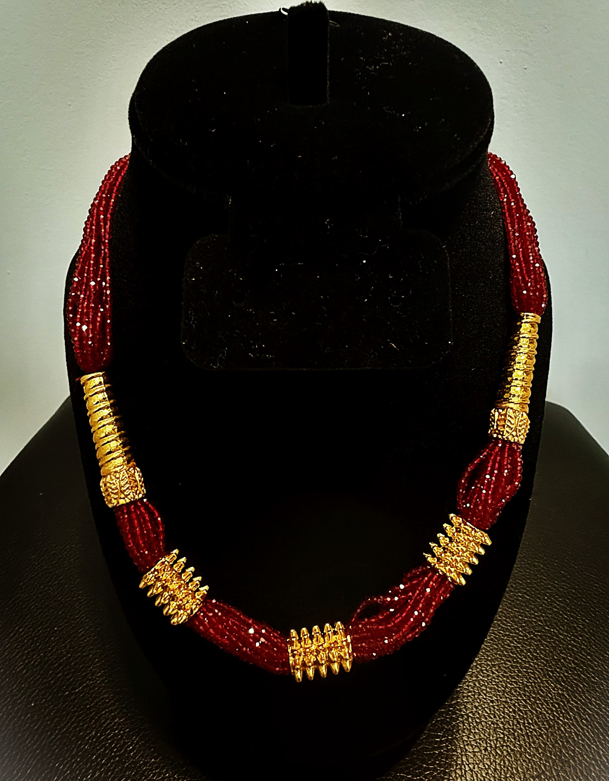 Keywords: Nepali necklace, handmade beaded jewelry, gold-tone necklace, black bead necklace, red bead necklace, ethnic jewelry from Nepal.